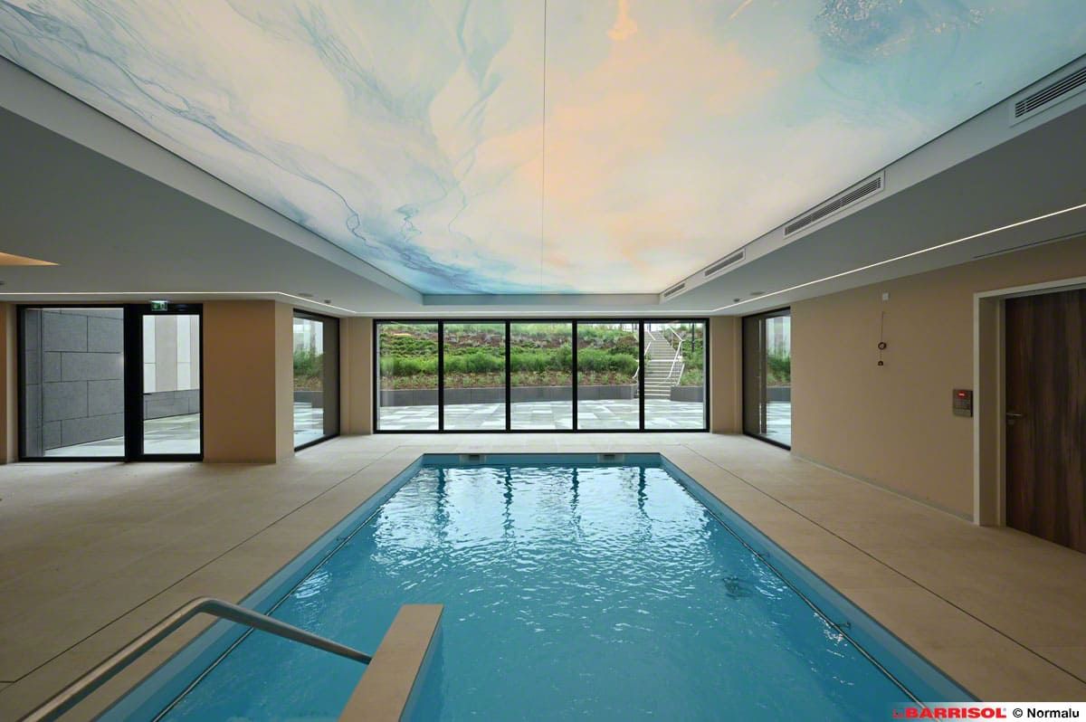 Dans ce projet, nous avons pris en main l’installation d’un plafond tendu imprimé rétro-éclairé. Un projet original pour apporter une ambiance unique à un couloir et à la piscine intérieure d’une future maison de repos.